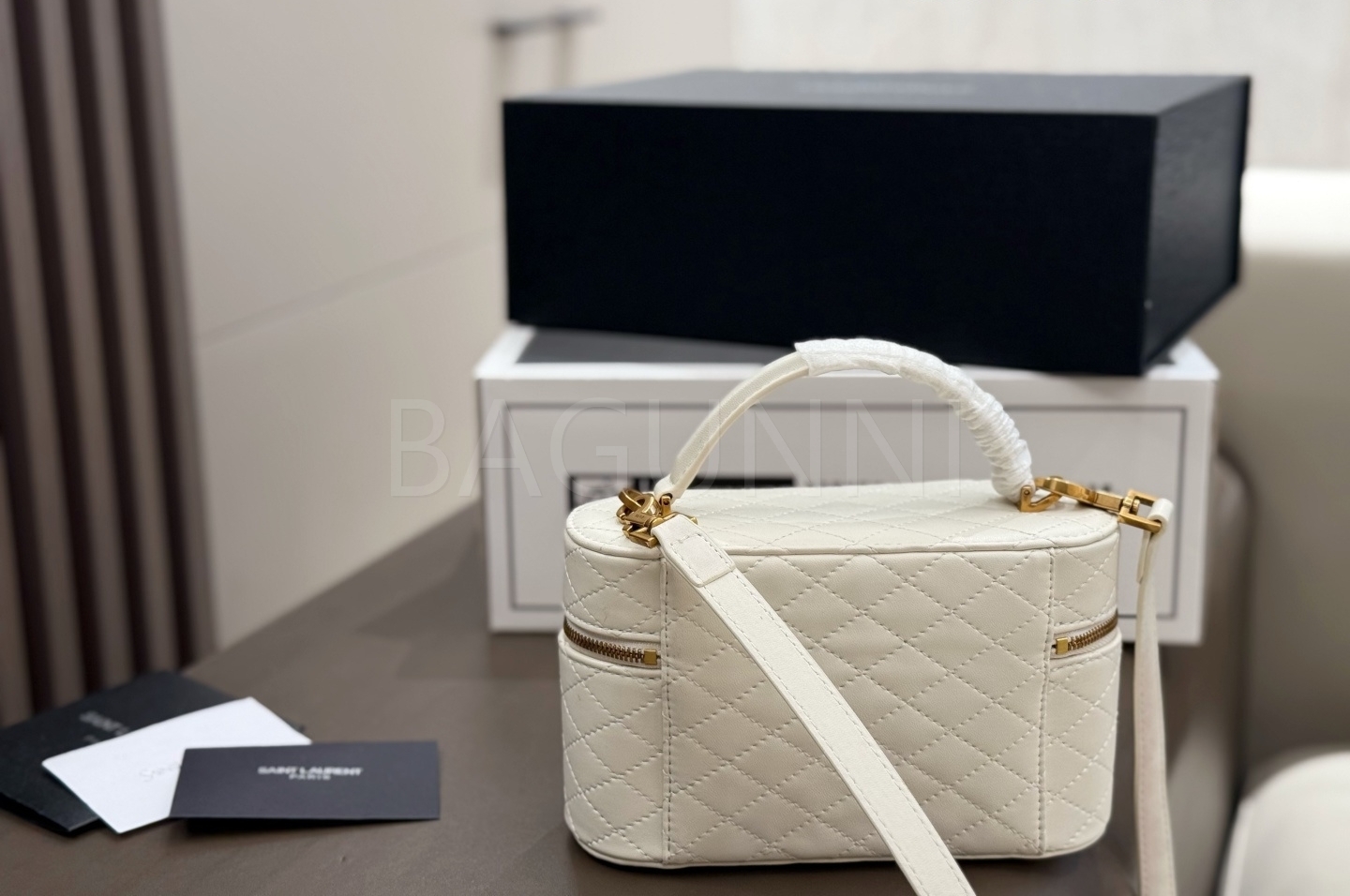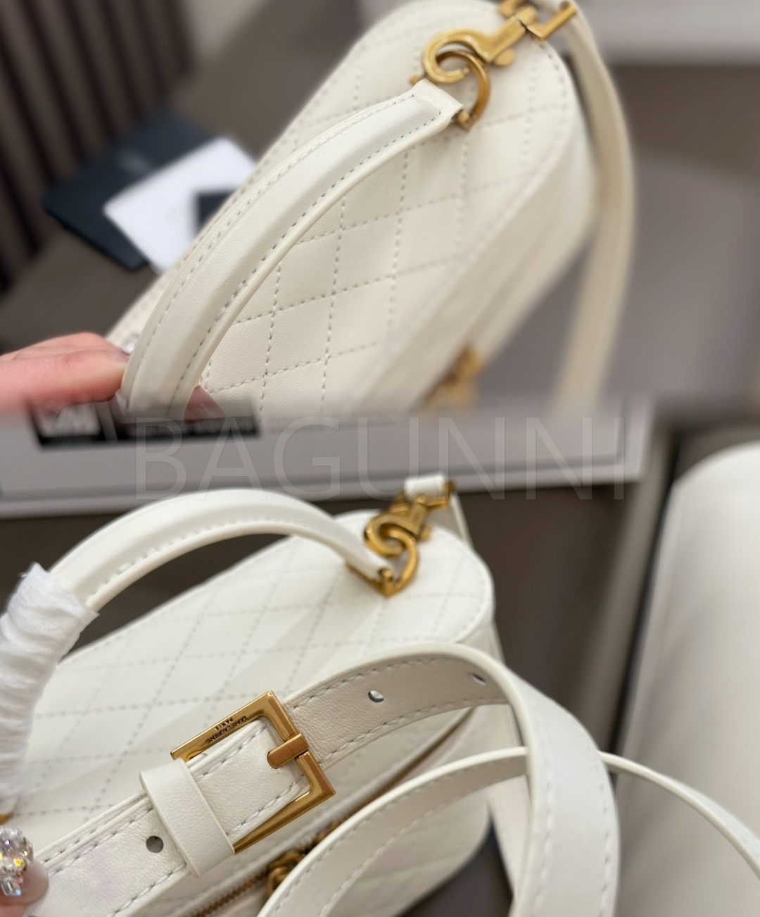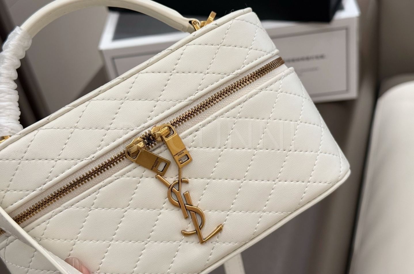 YSL 개비 바니티백입니다. 램스킨 특유의 질감이 자연스럽게 살아 있으며 화이트, 골드 톤이 어우러져 브랜드 특유의 분위기를 편하게 즐기기 좋습니다.