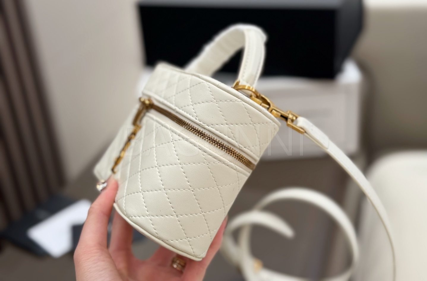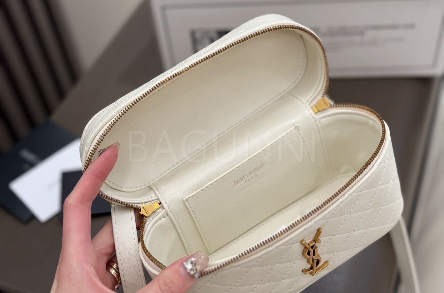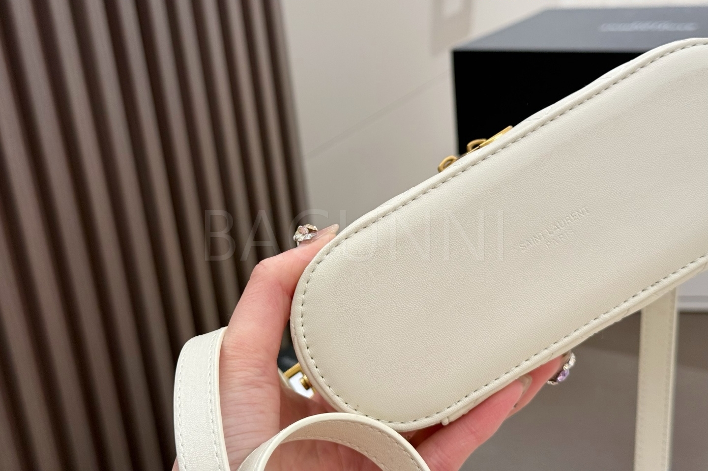 YSL 개비 바니티백입니다. 램스킨 특유의 질감이 자연스럽게 살아 있으며 화이트, 골드 톤이 어우러져 브랜드 특유의 분위기를 편하게 즐기기 좋습니다.