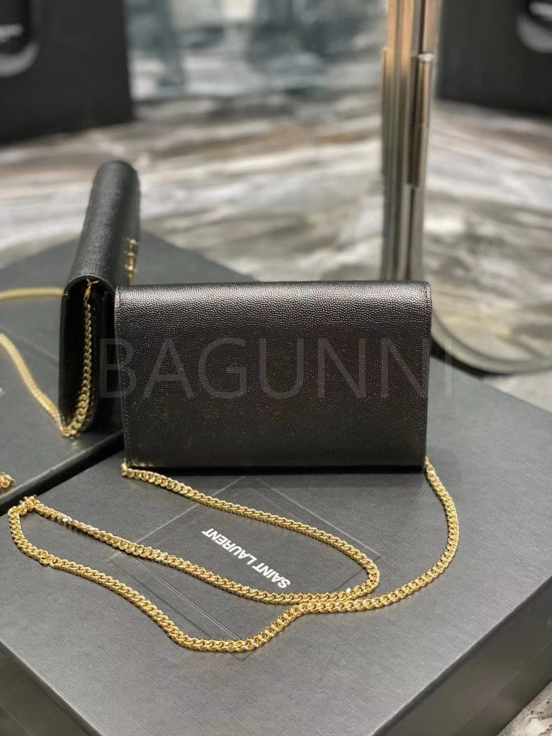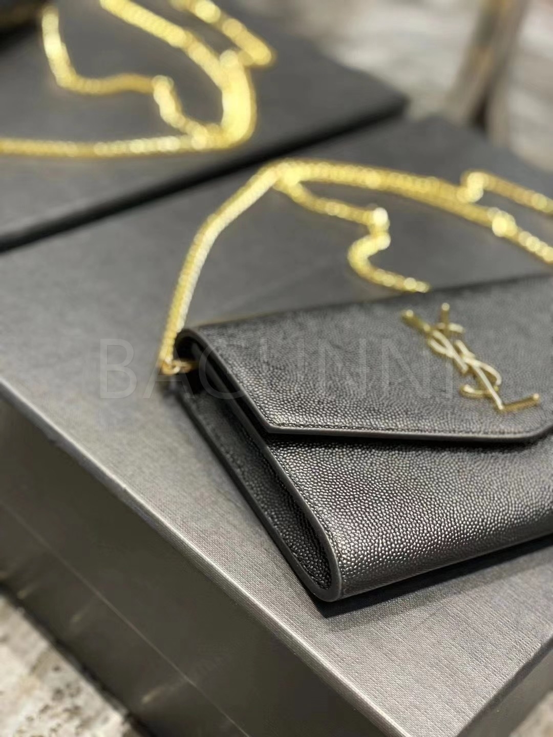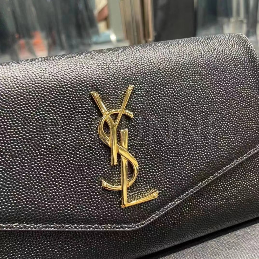 YSL 업타운 엔벨로프 체인 지갑 특유의 분위기가 자연스럽게 드러나는 디자인입니다.