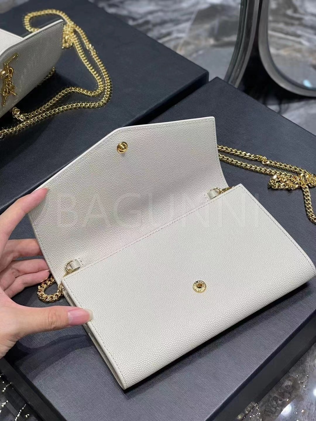 YSL 업타운 엔벨로프 체인 지갑 특유의 분위기가 자연스럽게 드러나는 디자인입니다.