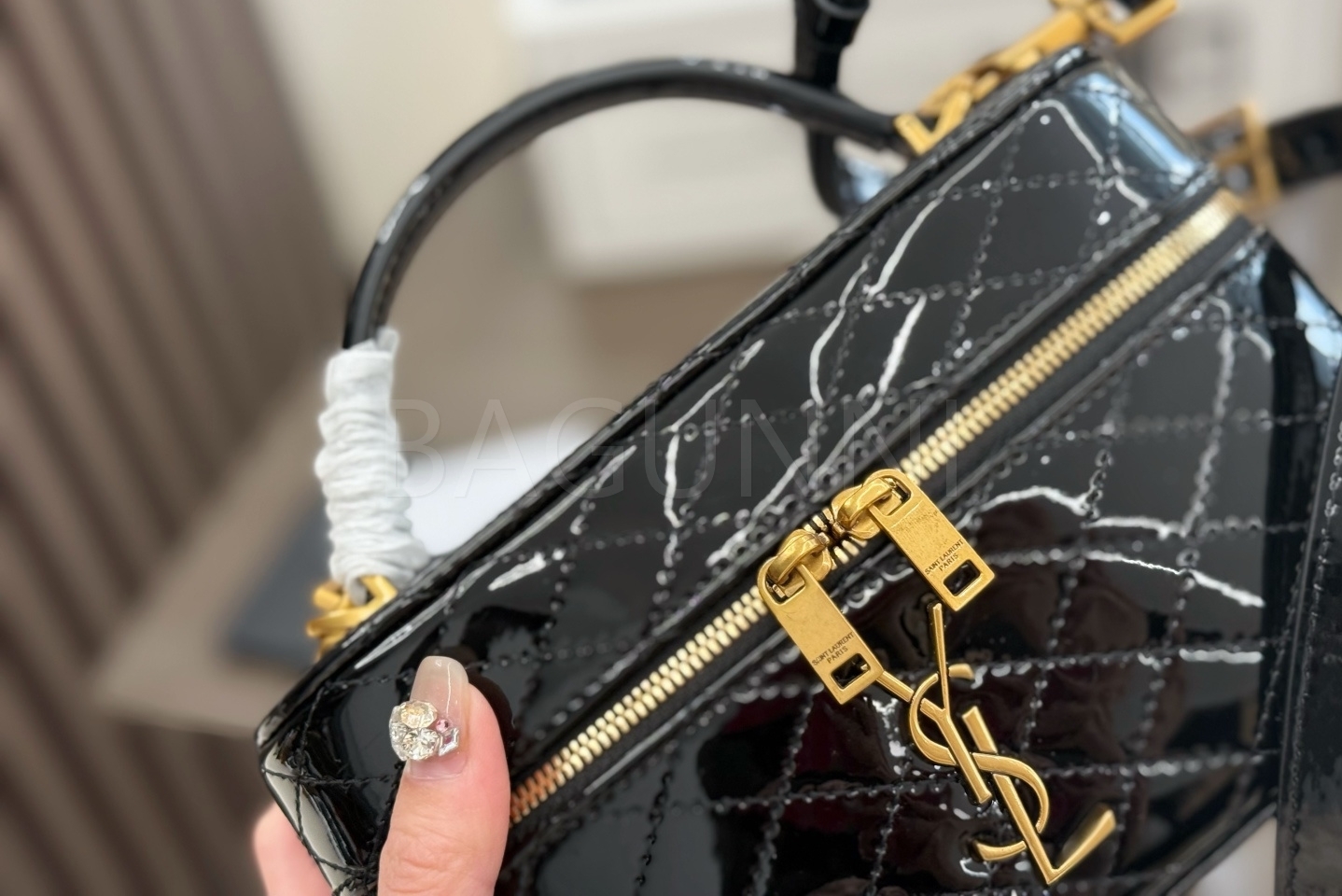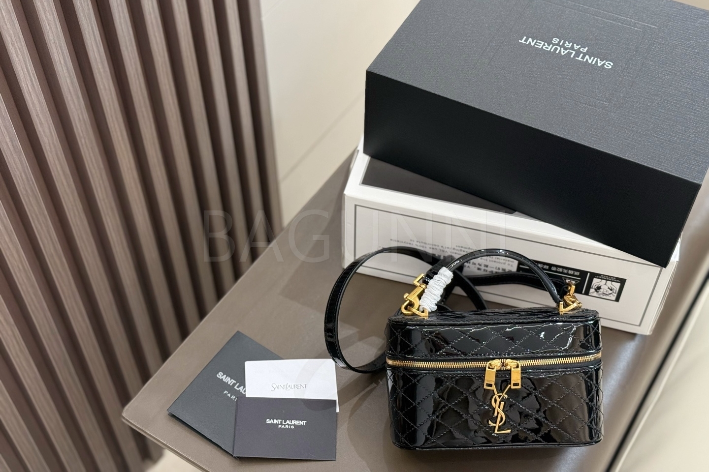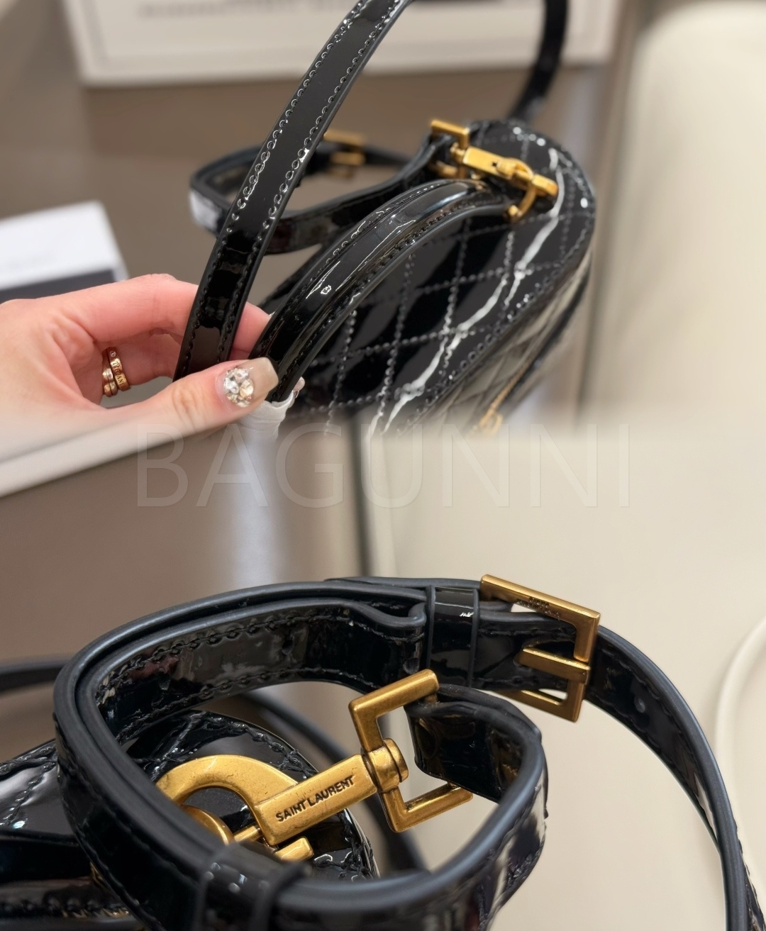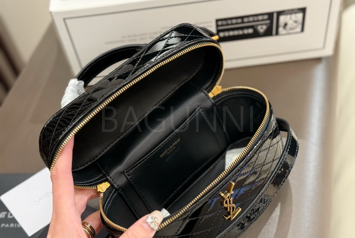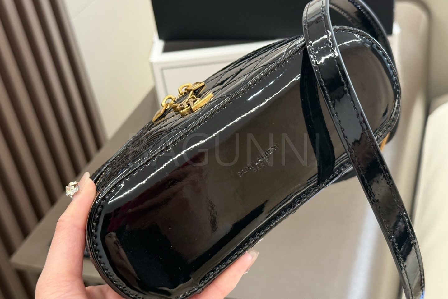 YSL 개비 박스백입니다. 페이턴트 가죽 특유의 질감이 자연스럽게 살아 있으며 블랙, 골드 톤이 어우러져 브랜드 특유의 분위기를 편하게 즐기기 좋습니다.