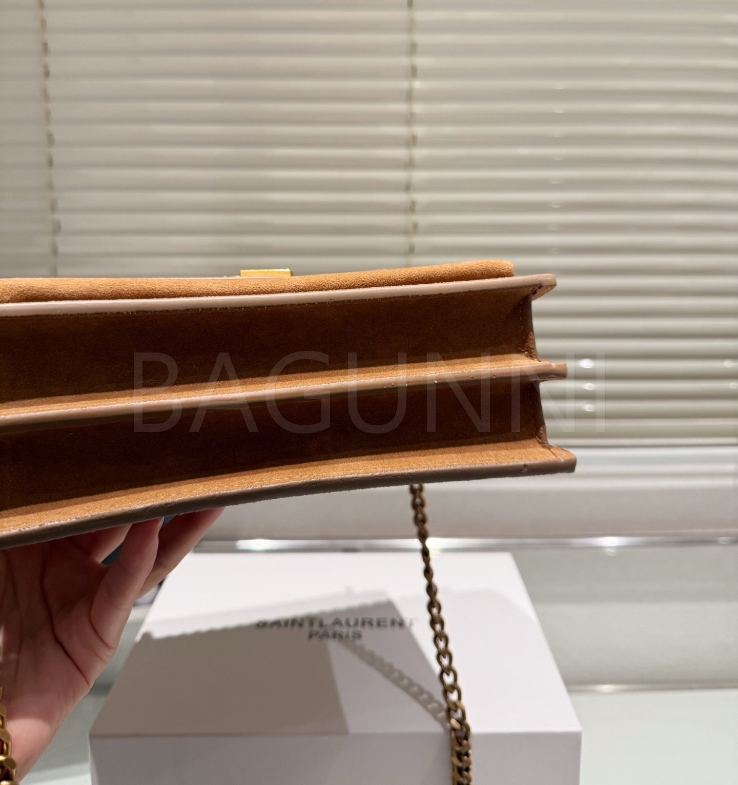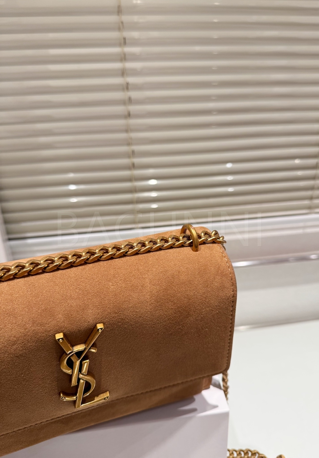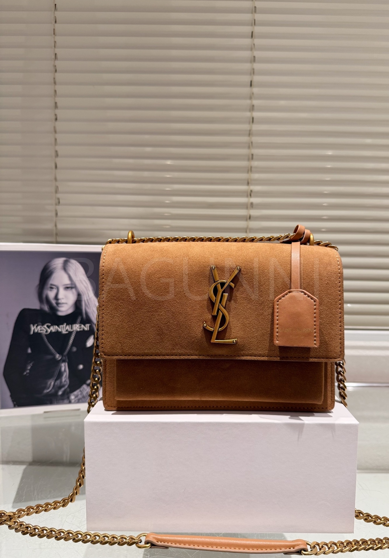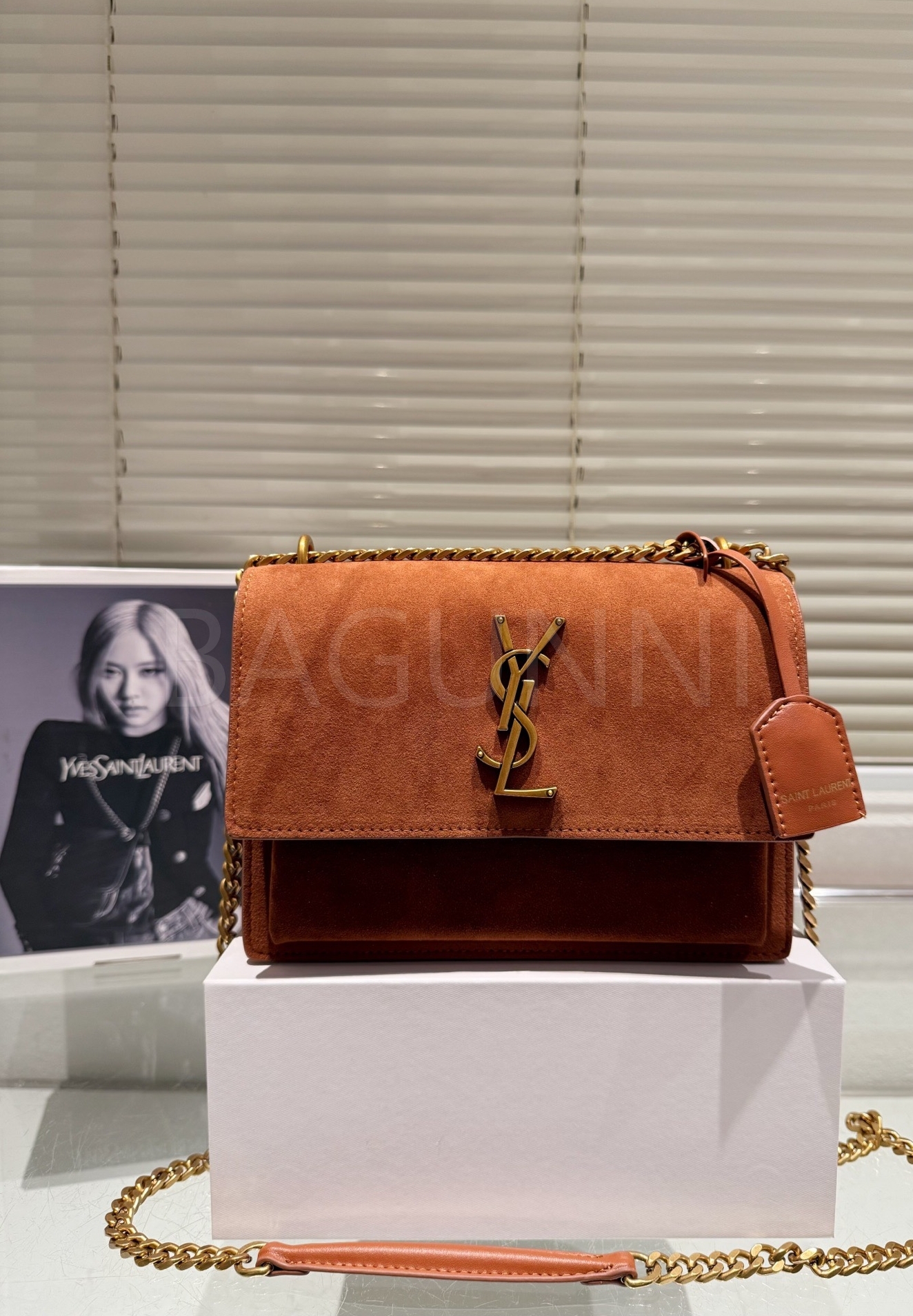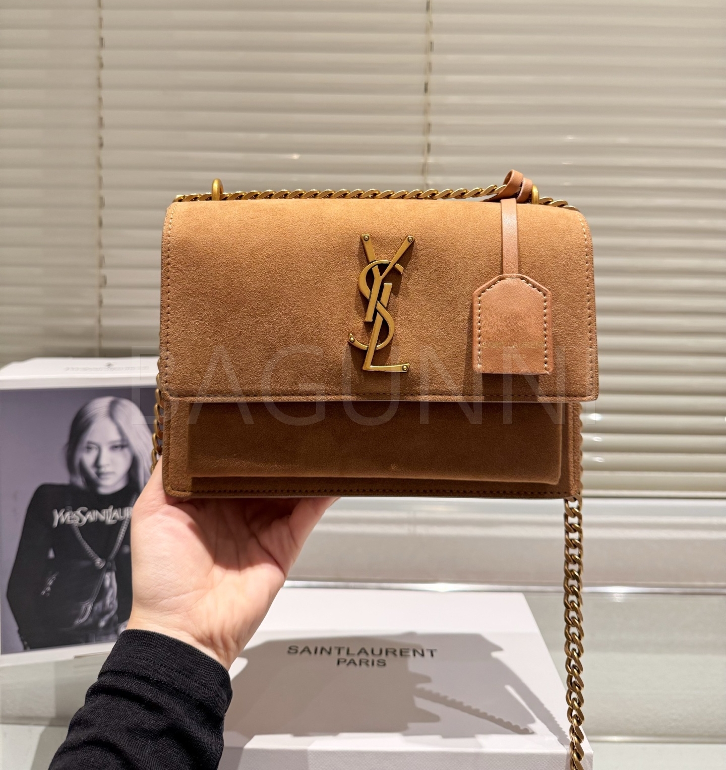 YSL 선셋 숄더백입니다. 스웨이드 특유의 질감이 자연스럽게 살아 있으며 브랜드 특유의 분위기를 편하게 즐기기 좋습니다.