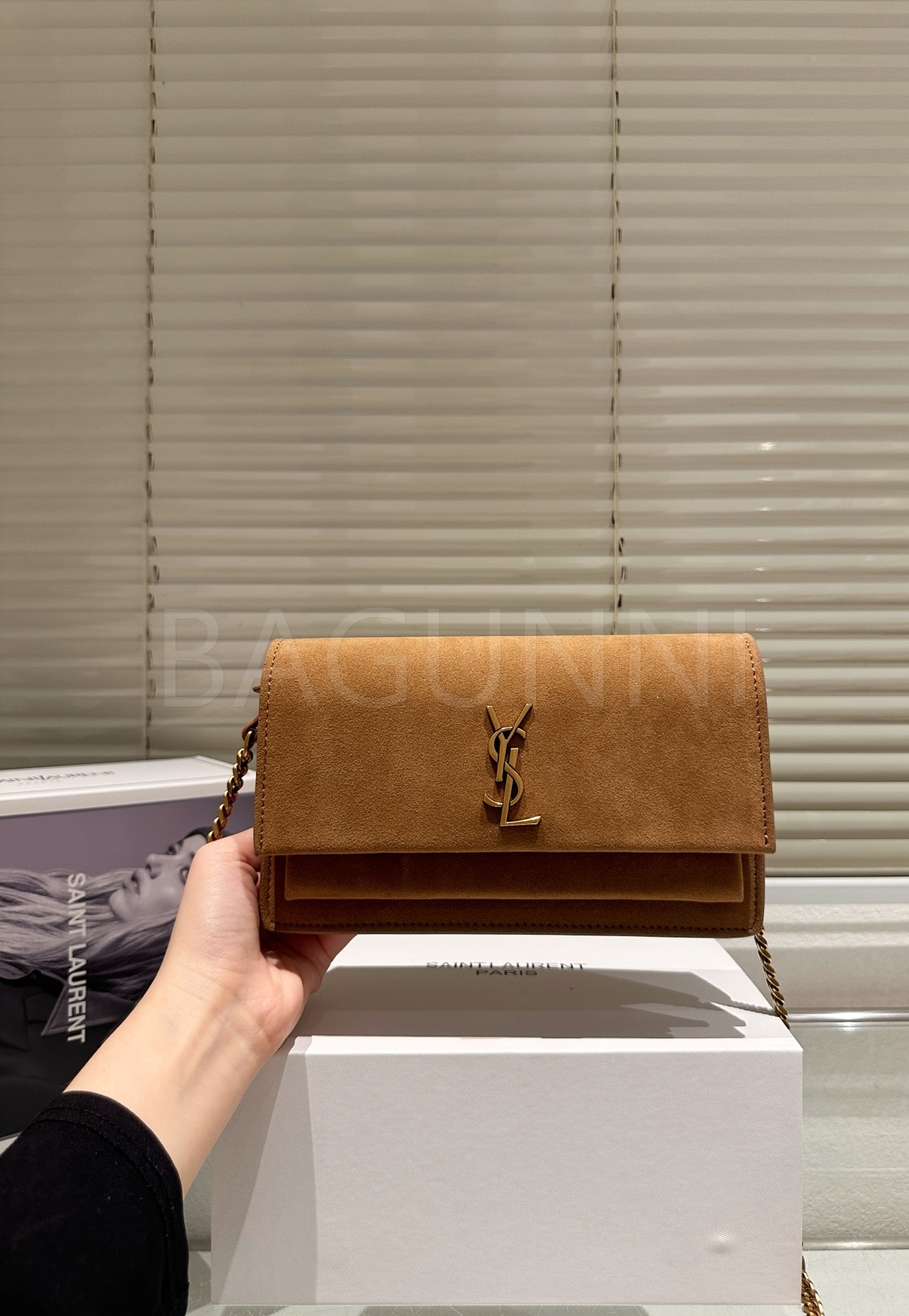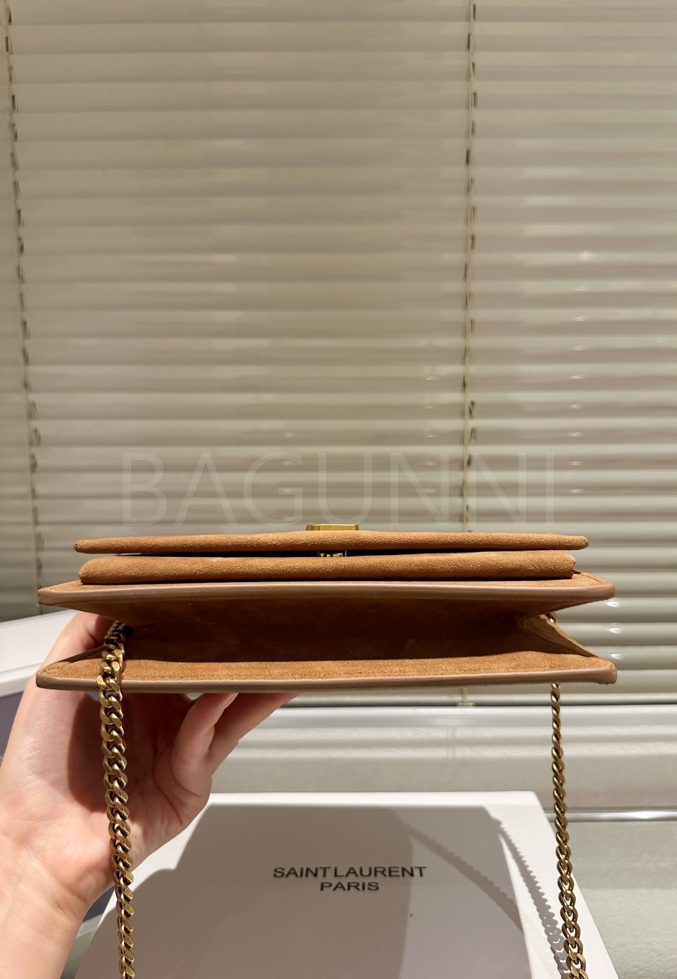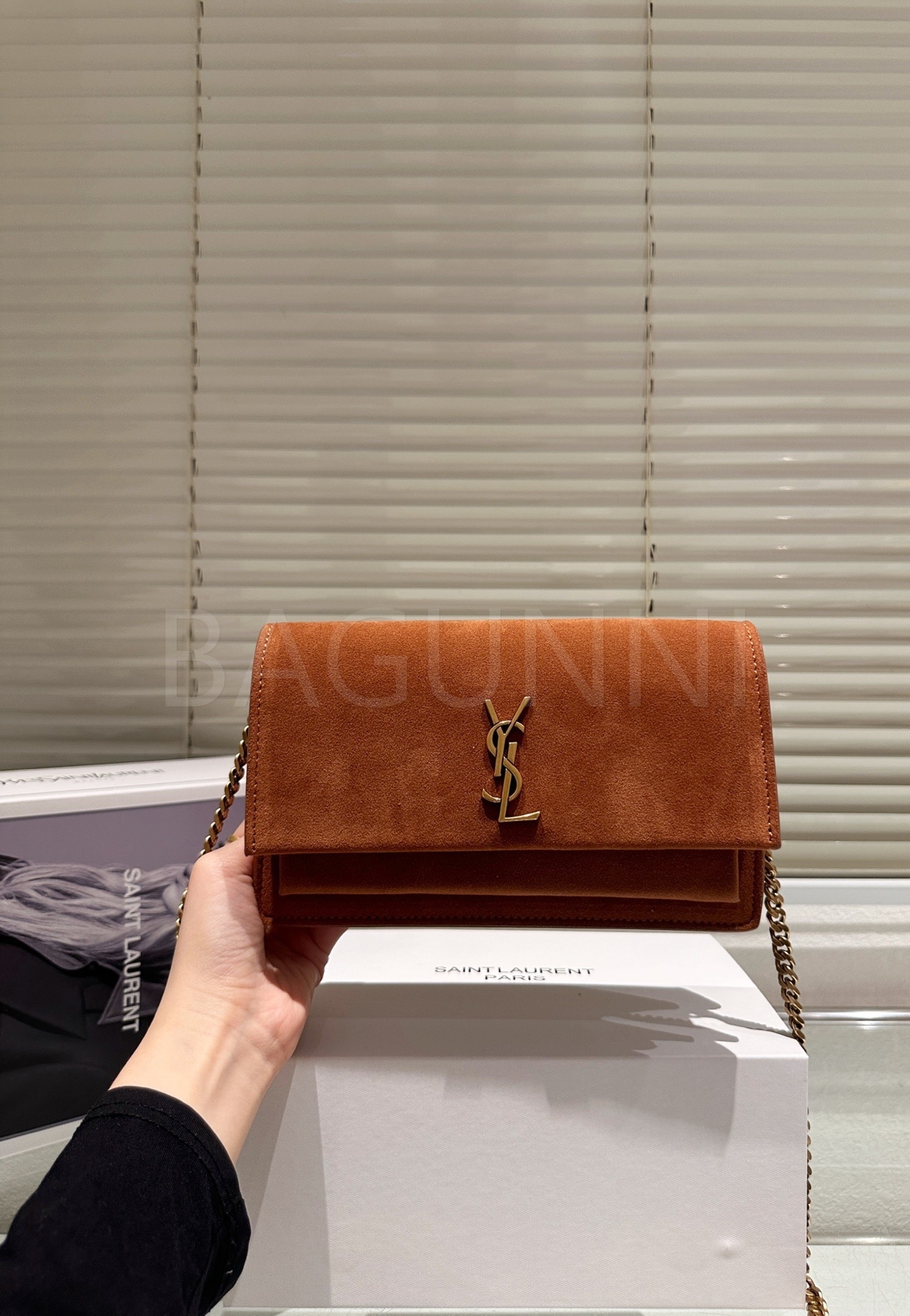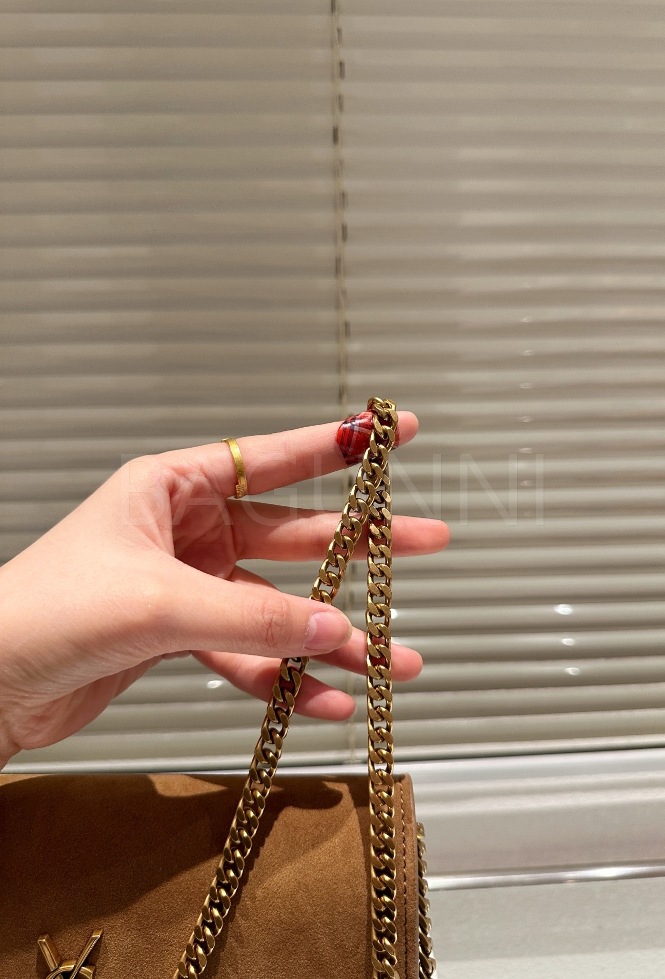YSL 니키 체인백입니다. 스웨이드 특유의 질감이 자연스럽게 살아 있으며 레드 톤이 어우러져 브랜드 특유의 분위기를 편하게 즐기기 좋습니다.
