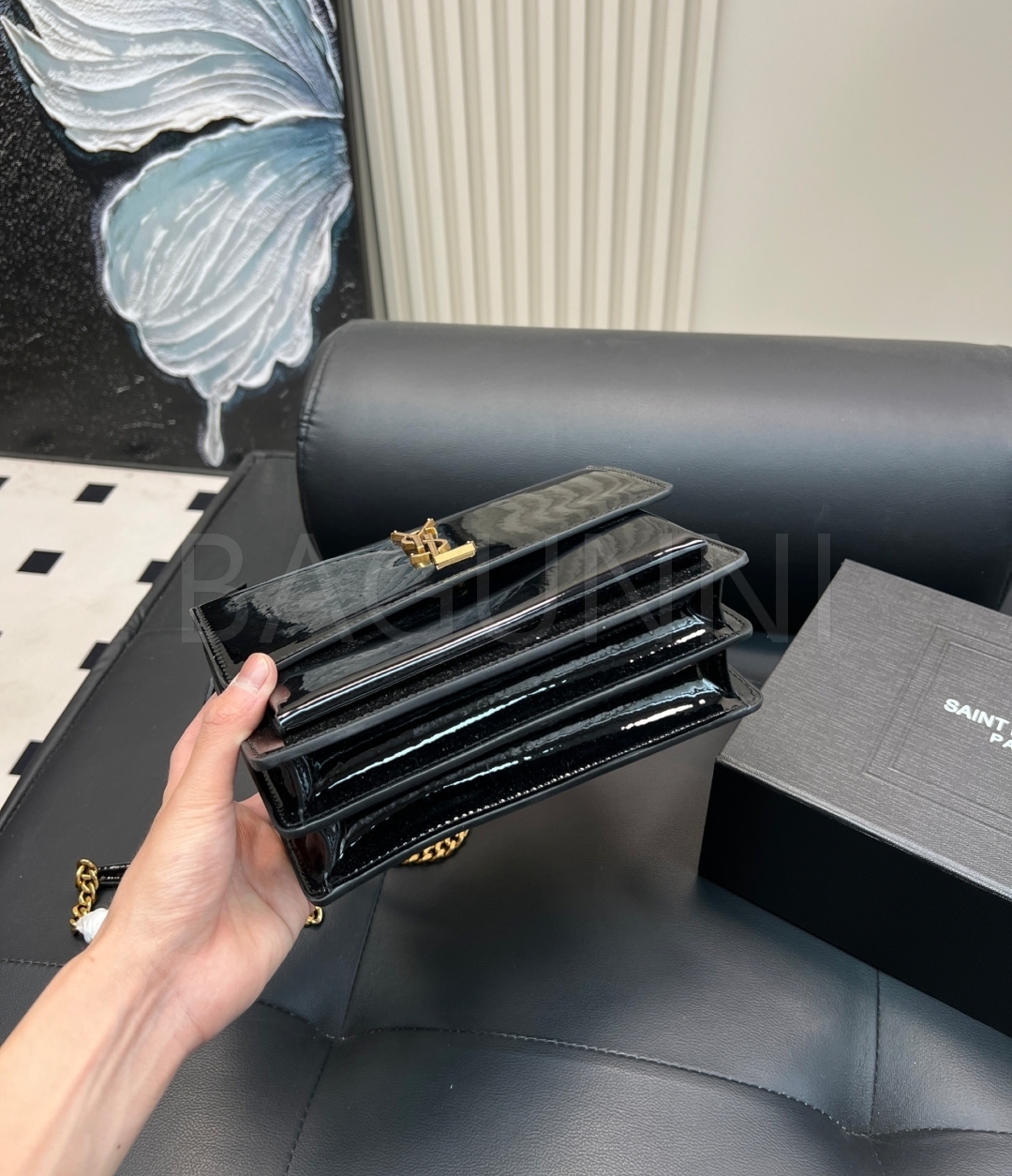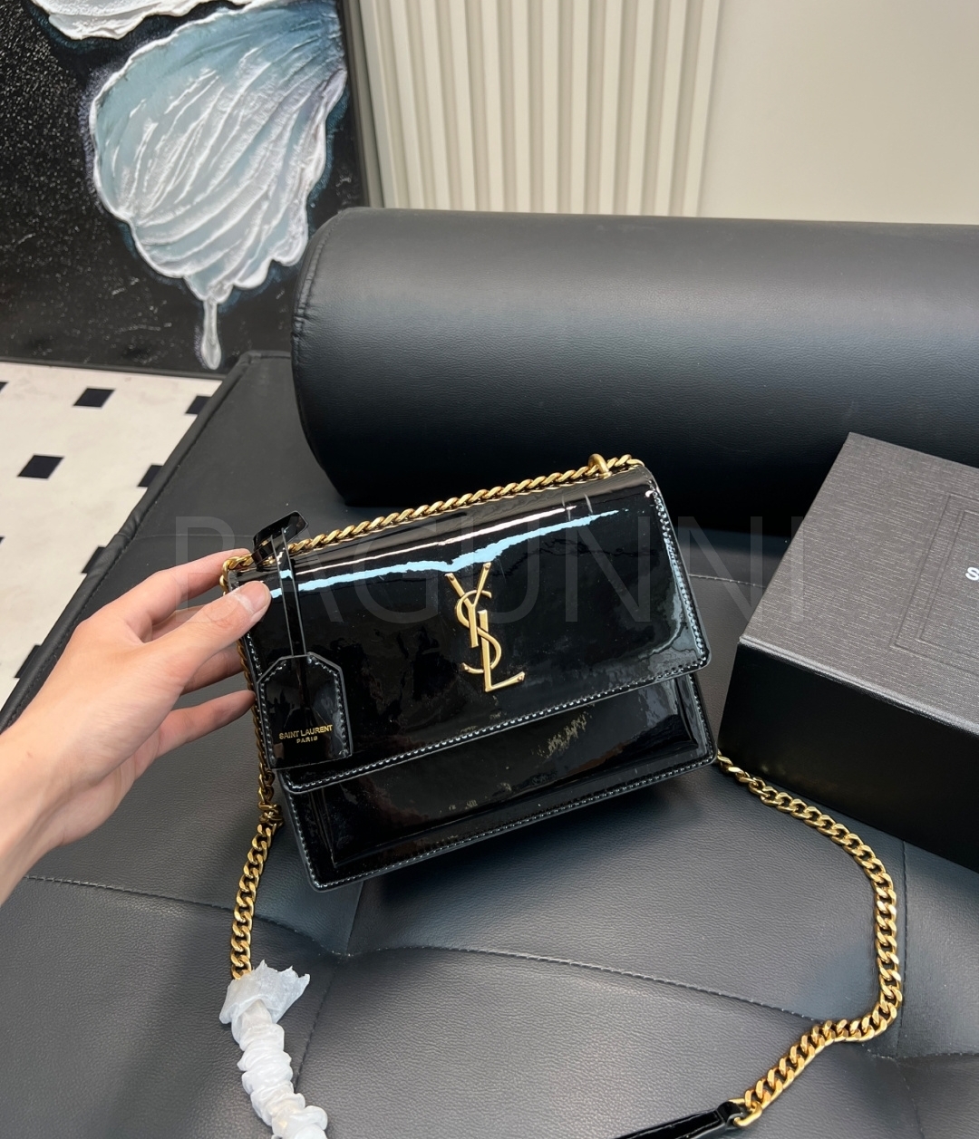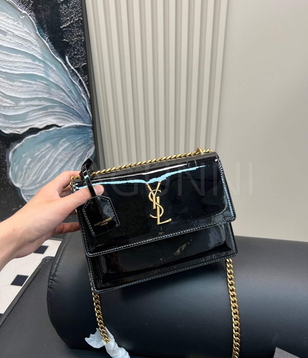 YSL 선셋 숄더백입니다. 페이턴트 가죽 특유의 질감이 자연스럽게 살아 있으며 브랜드 특유의 분위기를 편하게 즐기기 좋습니다.