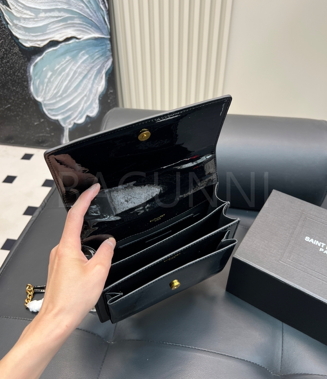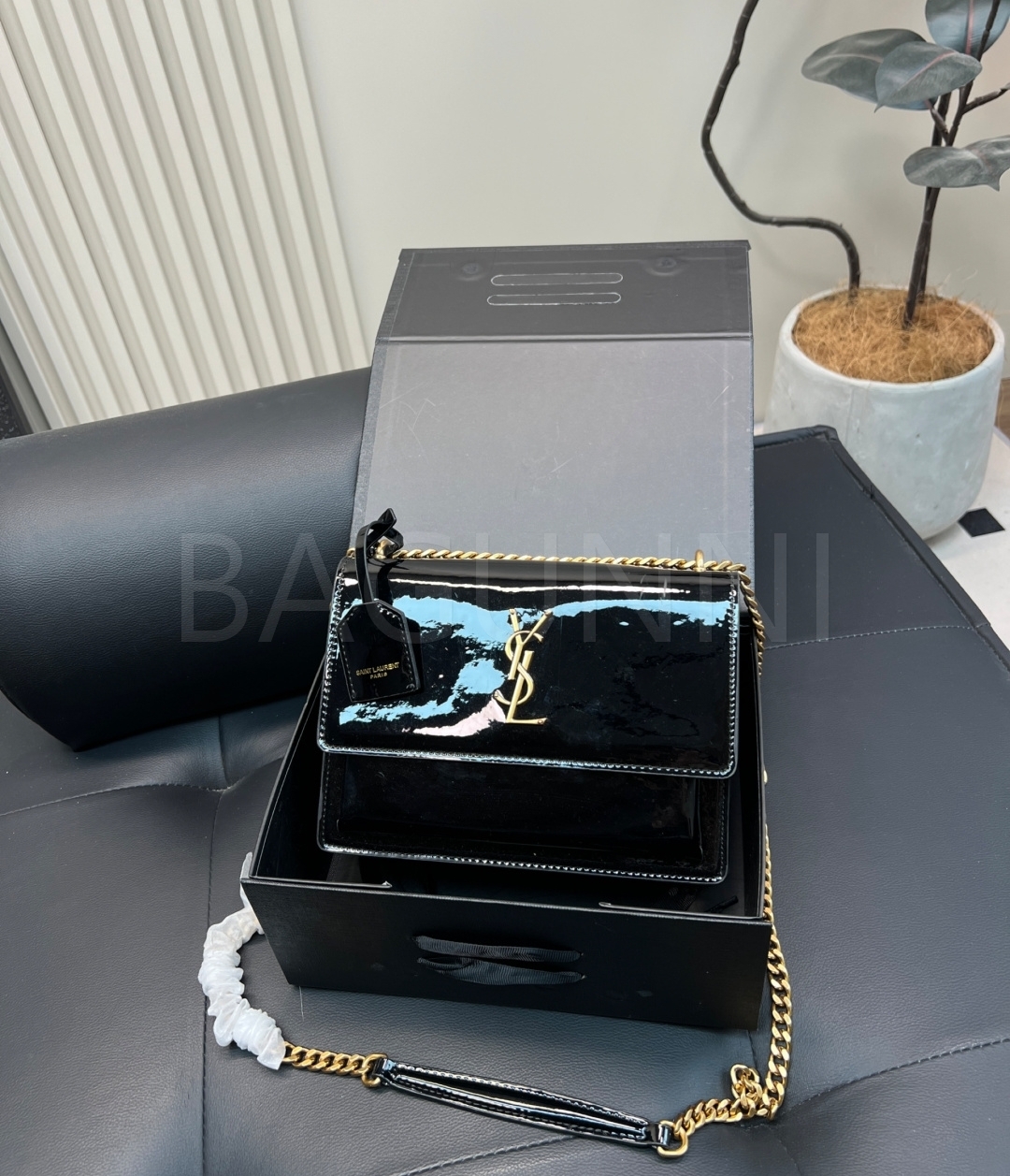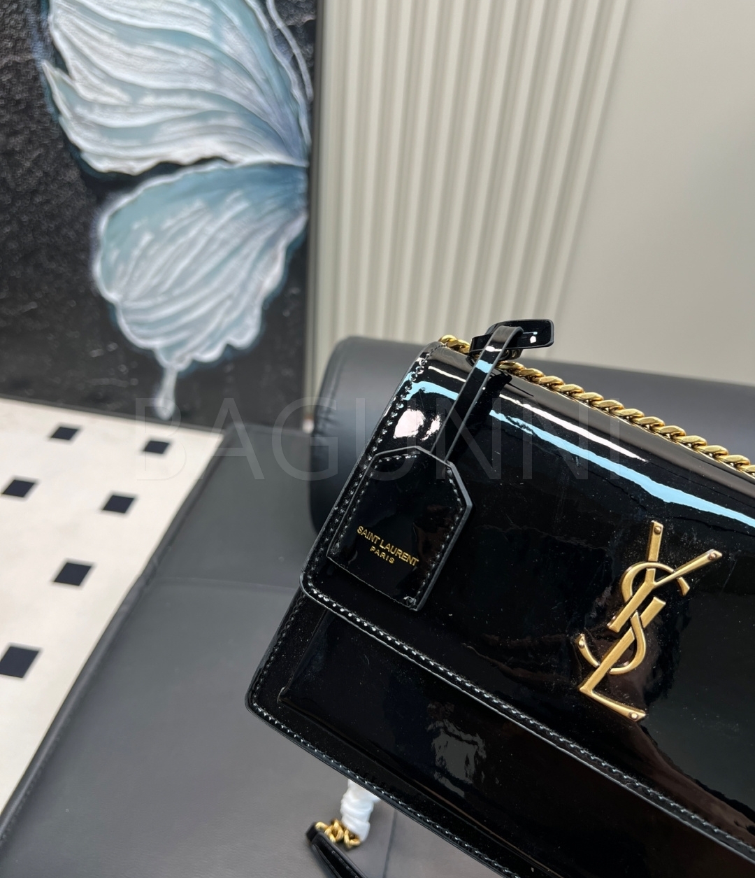 YSL 선셋 숄더백입니다. 페이턴트 가죽 특유의 질감이 자연스럽게 살아 있으며 브랜드 특유의 분위기를 편하게 즐기기 좋습니다.